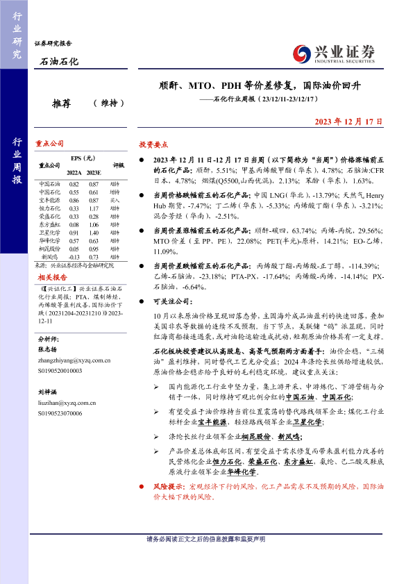 【兴业证券】【20231217】顺酐、MTO、PDH等价差修复,国际油价回升——石化行业周报(23/12/11-23/12/17)-19页
