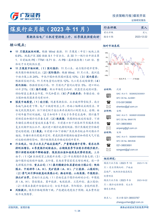 【广发证券】【20231222】20231222-广发证券-煤炭行业月报(2023年11月):寒潮来临电厂日耗有望持续上升,旺季煤炭供需向好-24页