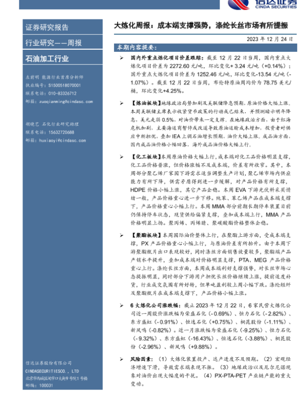 【信达证券】【20231224】大炼化周报:成本端支撑强势,涤纶长丝市场有所提振-17页