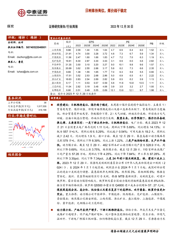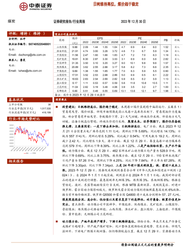 【中泰证券】【20231230】20231230-中泰证券-煤炭行业周报:日耗维持高位,煤价趋于稳定-26页