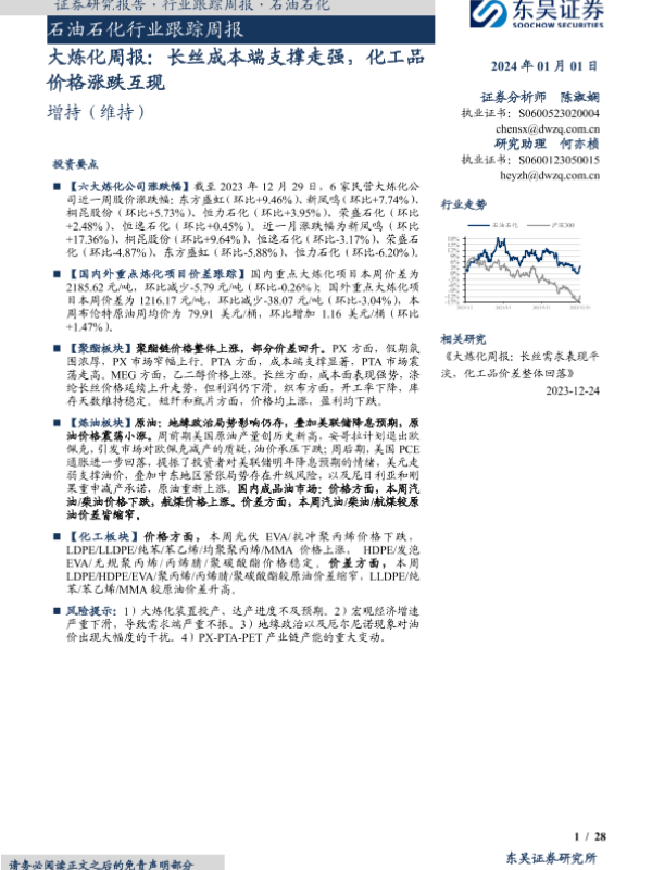 【东吴证券】【20240101】大炼化周报:长丝成本端支撑走强,化工品价格涨跌互现-28页