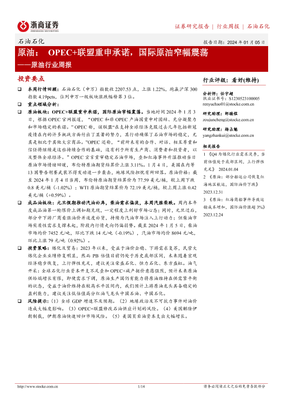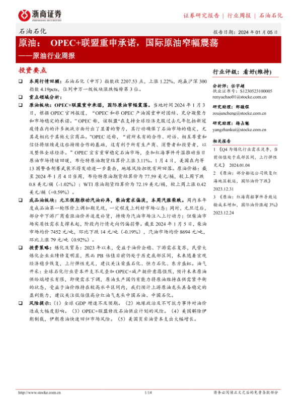 【浙商证券】【20240105】20240105-浙商证券-原油行业周报:OPEC+联盟重申承诺,国际原油窄幅震荡-14页