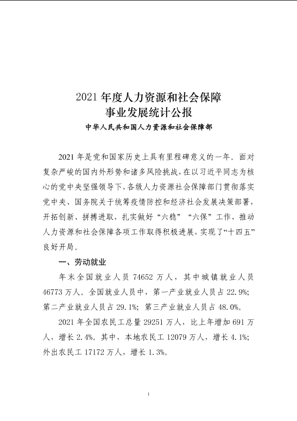【中华人民共和国人力资源和社会保障部】【20210101】2021年度人力资源和社会保障事业发展统计公报-14页