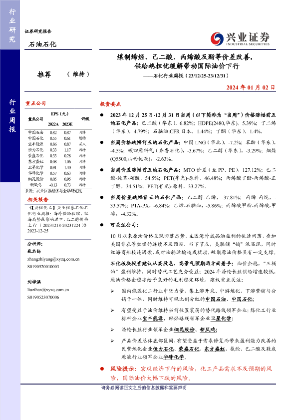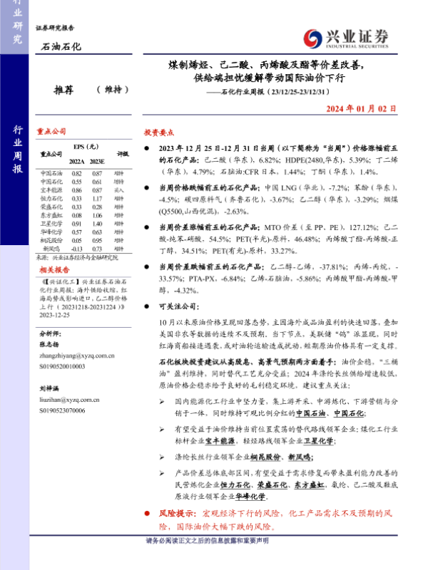 【兴业证券】【20240102】煤制烯烃、己二酸、丙烯酸及酯等价差改善,供给端担忧缓解带动国际油价下行——石化行业周报(23/12/25-23/12/31)-18页