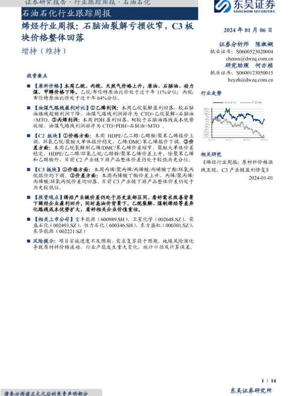 【东吴证券】【20240106】20240106-东吴证券-烯烃行业周报:石脑油裂解亏损收窄,C3板块价格整体回落-14页