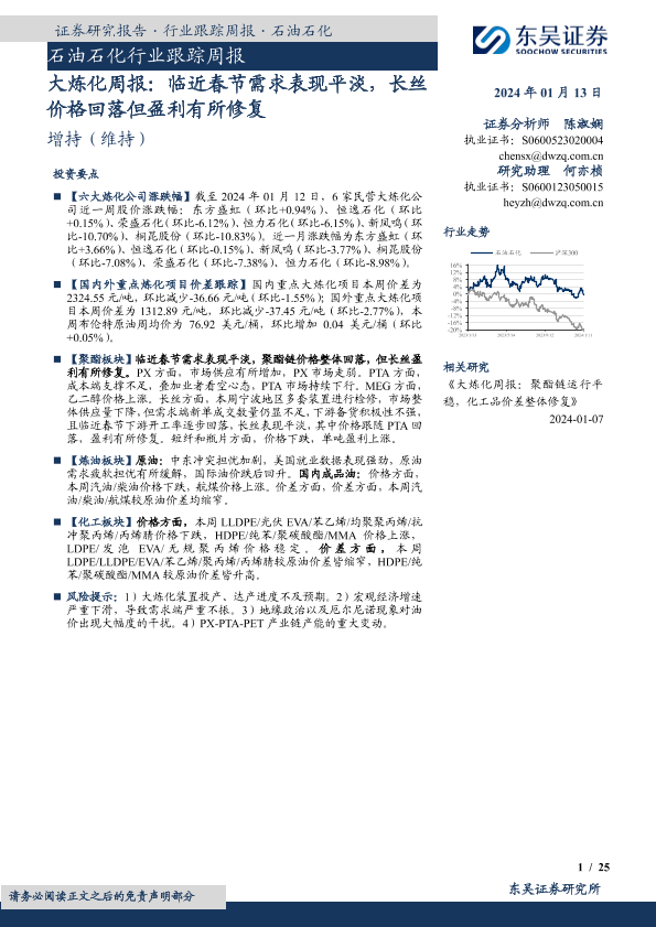 【东吴证券】【20240113】大炼化周报:临近春节需求表现平淡,长丝价格回落但盈利有所修复-25页