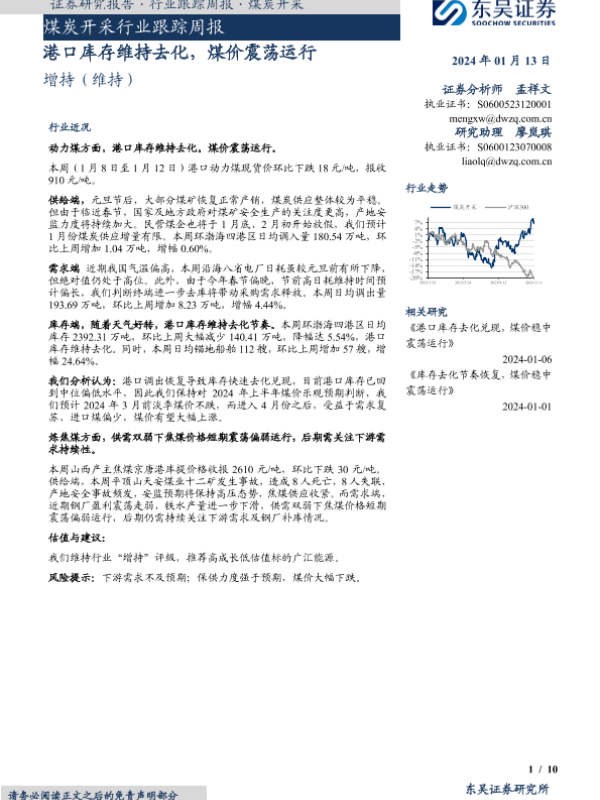 【东吴证券】【20240113】20240113-东吴证券-煤炭开采行业跟踪周报:港口库存维持去化,煤价震荡运行-10页