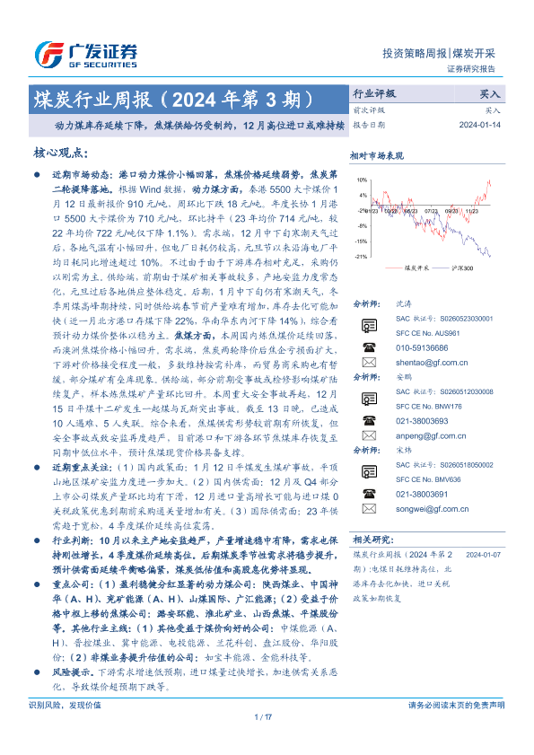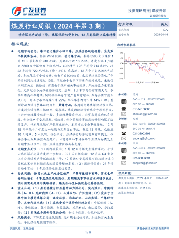 【广发证券】【20240114】2024年第3期煤炭行业周报:动力煤库存延续下降,焦煤供给仍受制约,12月高位进口或难持续-17页