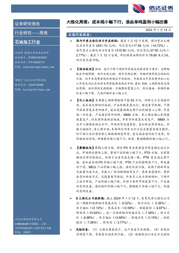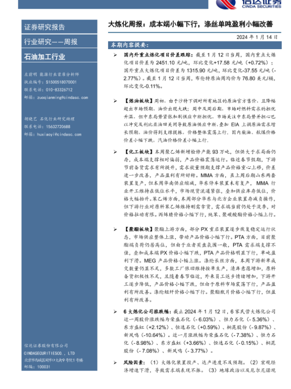 【信达证券】【20240114】大炼化周报:成本端小幅下行,涤丝单吨盈利小幅改善-20页