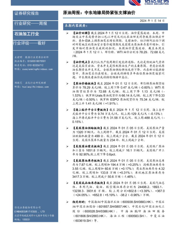 【信达证券】【20240114】原油周报:中东地缘局势紧张支撑油价-26页