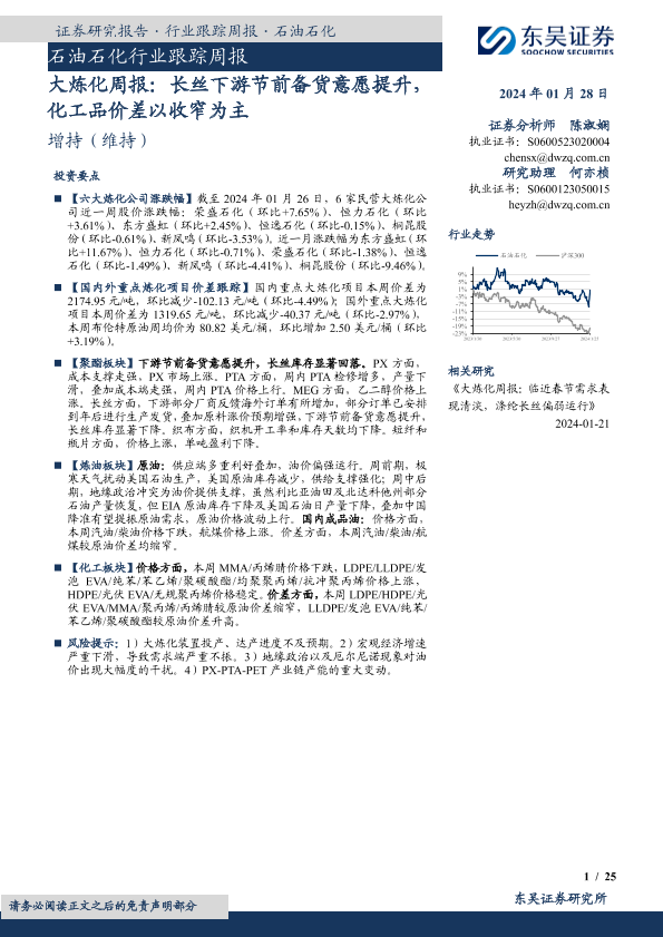 【东吴证券】【20240128】20240128-东吴证券-大炼化周报:长丝下游节前备货意愿提升,化工品价差以收窄为主-25页