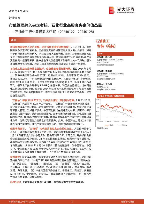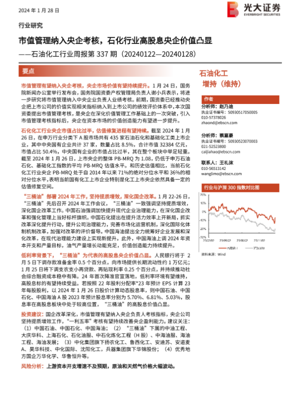 【光大证券】【20240128】20240128-光大证券-石油化工行业周报第337期:市值管理纳入央企考核,石化行业高股息央企价值凸显-20页