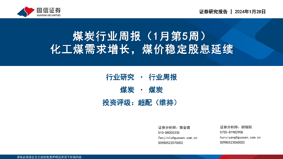 【国信证券】【20240128】20240128-国信证券-煤炭行业周报(1月第5周):化工煤需求增长,煤价稳定股息延续-30页