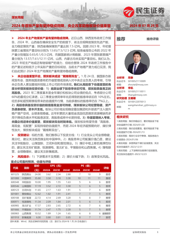 【民生证券】【20240128】2024年晋陕产量有望持稳或微降,央企改革助推板块价值重塑-27页