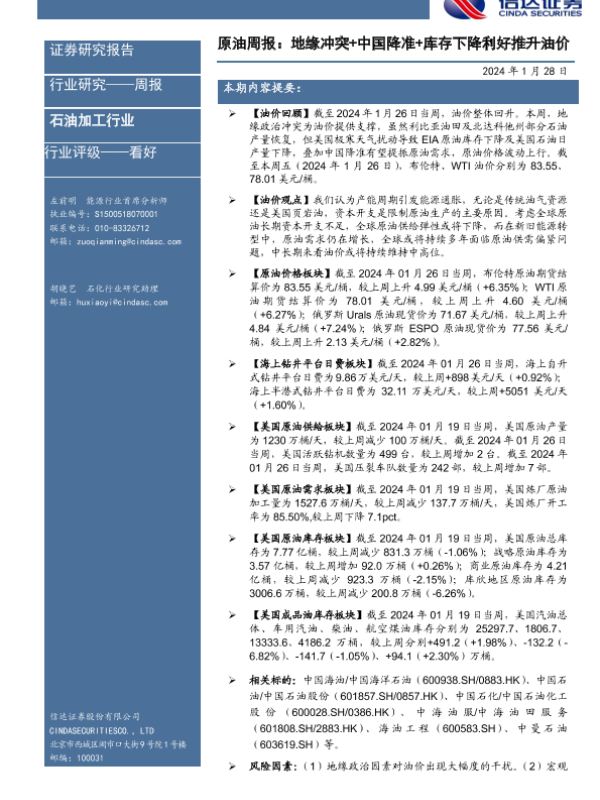 【信达证券】【20240128】原油周报:地缘冲突+中国降准+库存下降利好推升油价-26页