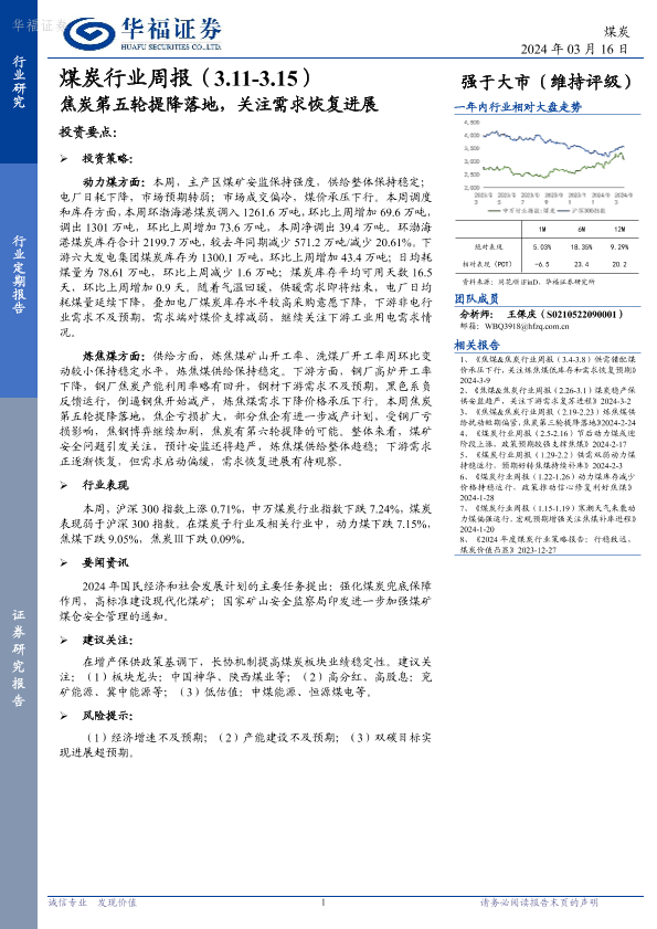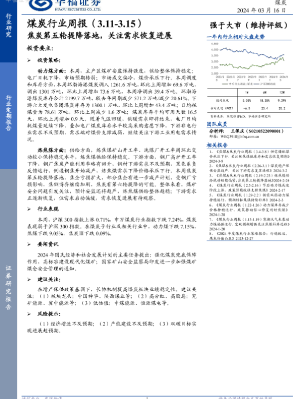 【华福证券】【20240316】煤炭行业周报:焦炭第五轮提降落地,关注需求恢复进展-17页