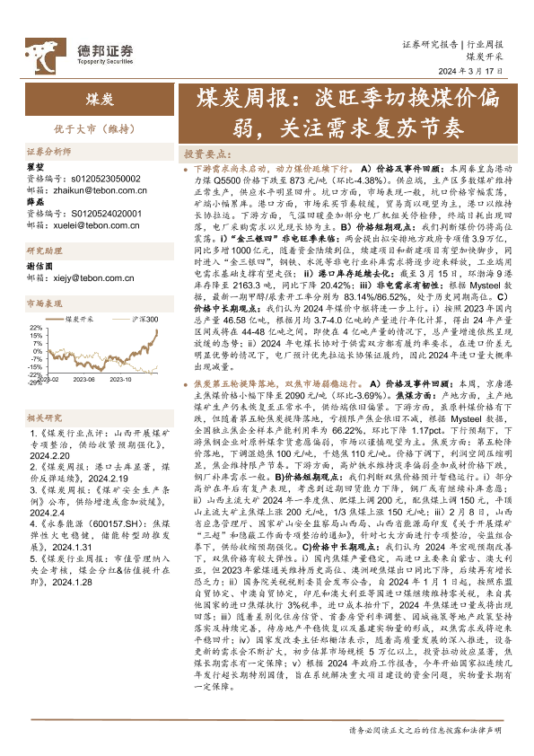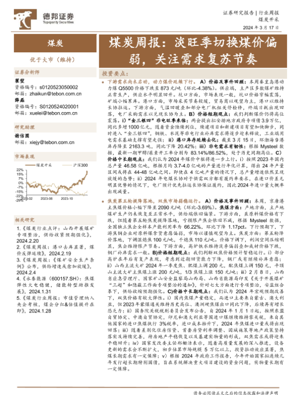 【德邦证券】【20240317】煤炭周报:淡旺季切换煤价偏弱,关注需求复苏节奏-17页