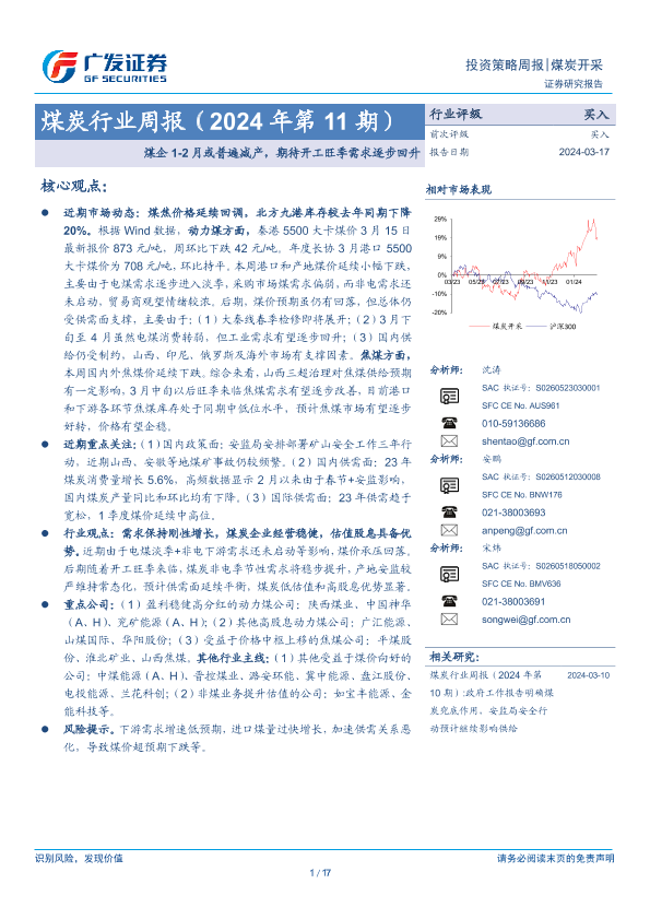 【广发证券】【20240317】2024年第11期煤炭行业周报:煤企1-2月或普遍减产,期待开工旺季需求逐步回升-17页