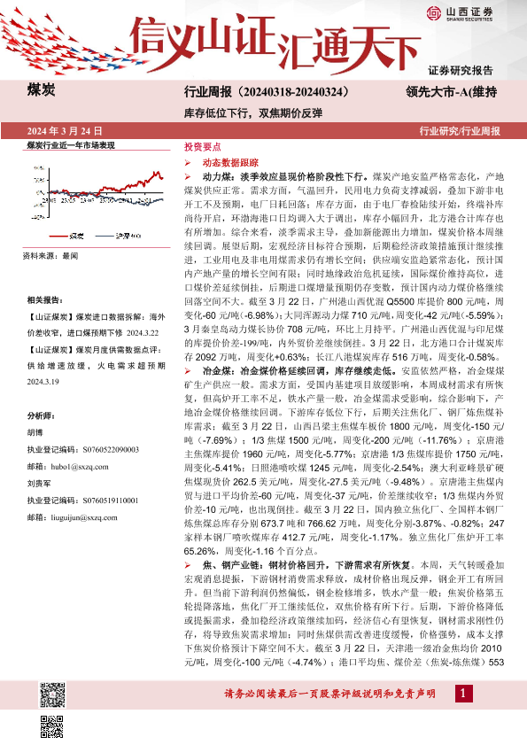 【山西证券】【20240324】煤炭行业周报:库存低位下行,双焦期价反弹-18页
