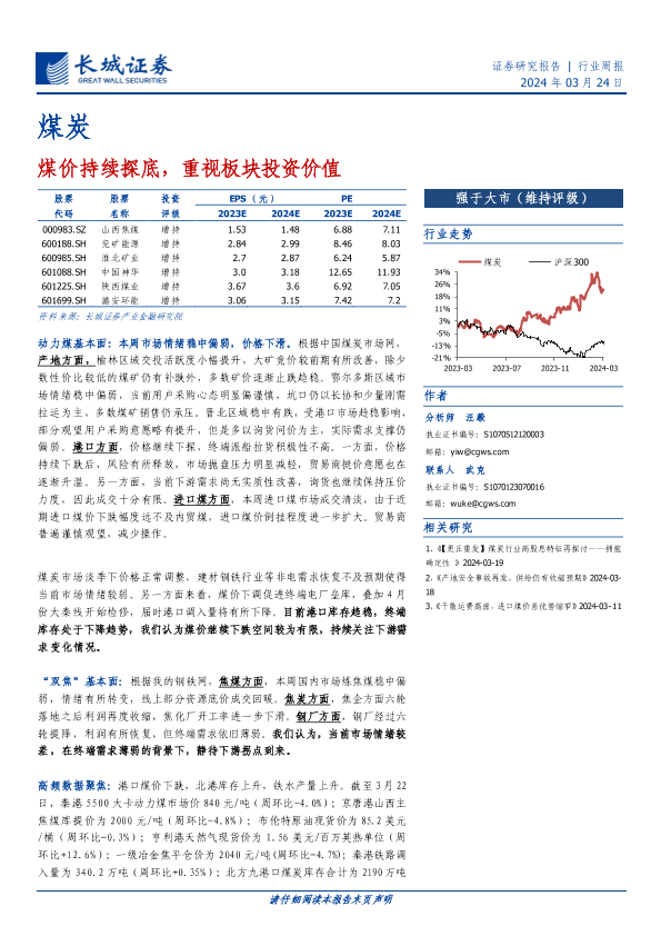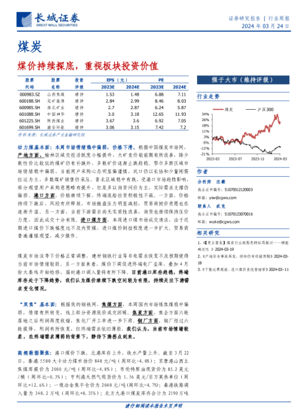 【长城证券】【20240324】20240324-长城证券-煤炭行业周报:煤价持续探底,重视板块投资价值-19页