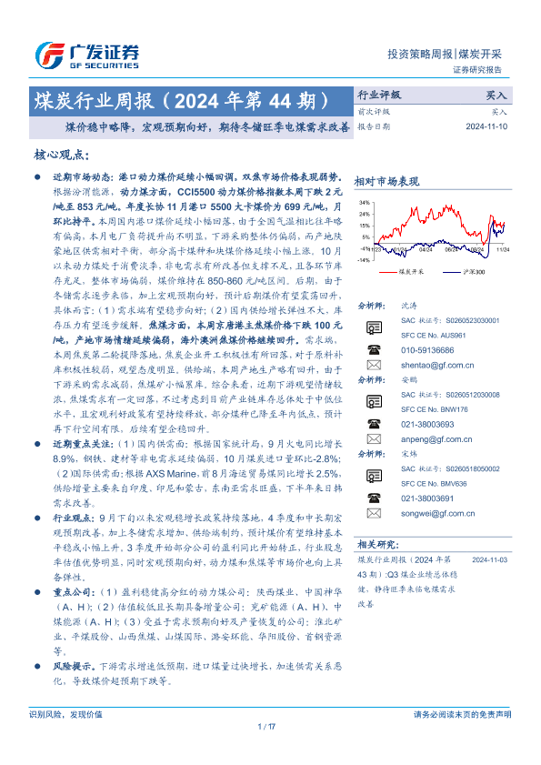 【广发证券】【20241110】2024年第44期煤炭行业周报:煤价稳中略降,宏观预期向好,期待冬储旺季电煤需求改善-17页
