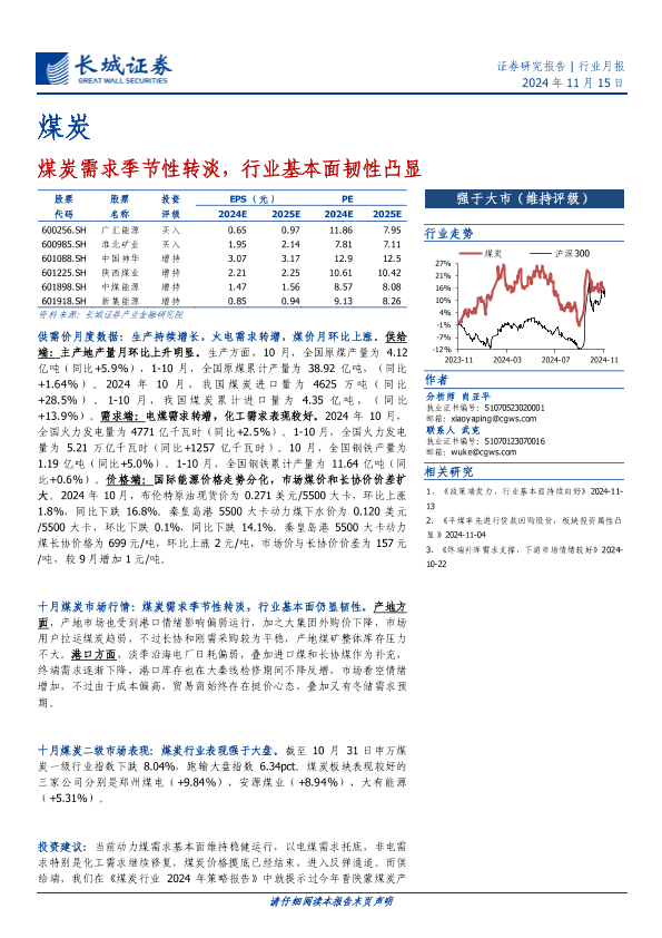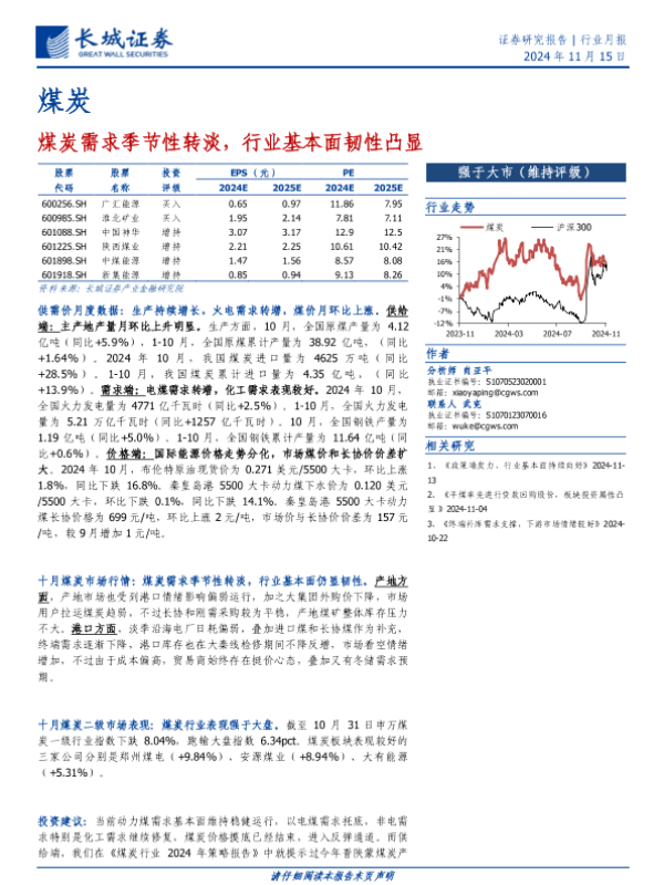【长城证券】【20241115】煤炭需求季节性转淡,行业基本面韧性凸显-13页