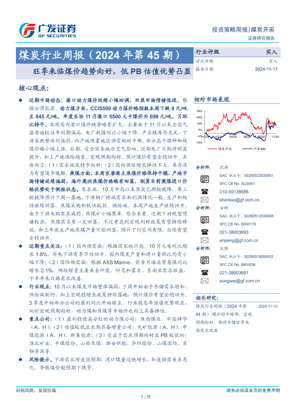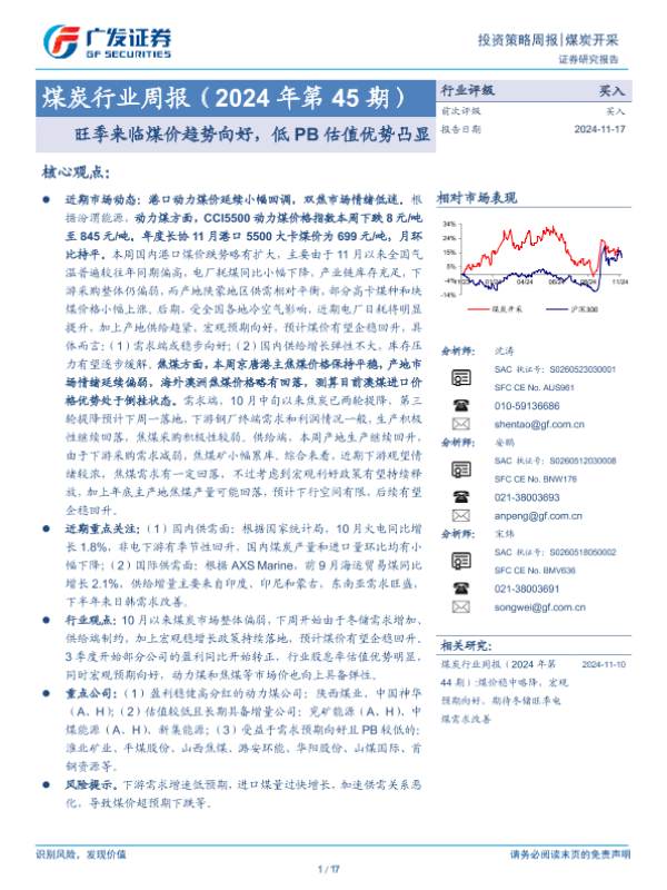 【广发证券】【20241117】2024年第45期煤炭行业周报:旺季来临煤价趋势向好,低PB估值优势凸显-17页