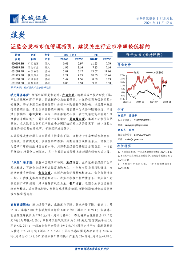【长城证券】【20241117】煤炭行业周报:证监会发布市值管理指引,建议关注行业市净率较低标的-19页