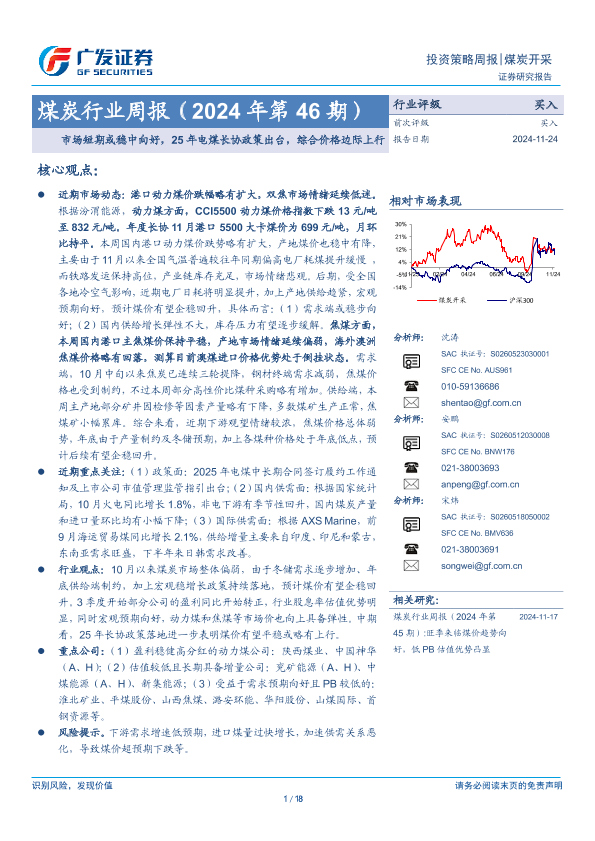 【广发证券】【20241124】煤炭行业周报(2024年第46期):市场短期或稳中向好,25年电煤长协政策出台,综合价格边际上行-18页