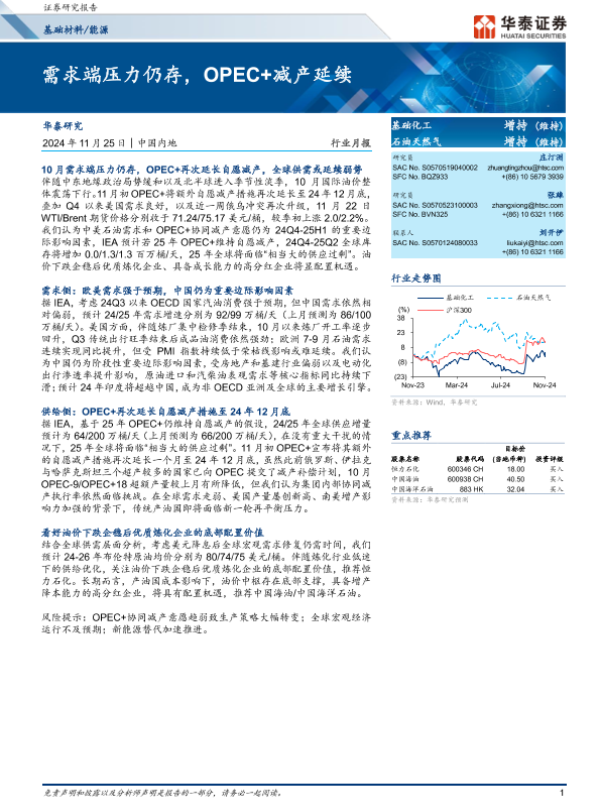 【华泰证券】【20241125】基础材料 能源行业月报:需求端压力仍存,OPEC+减产延续-10页