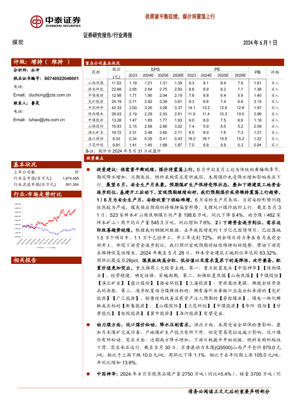 【中泰证券】【20240601】20240601-中泰证券-煤炭行业周报:供需紧平衡延续,煤价将震荡上行-28页
