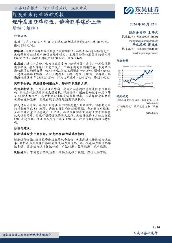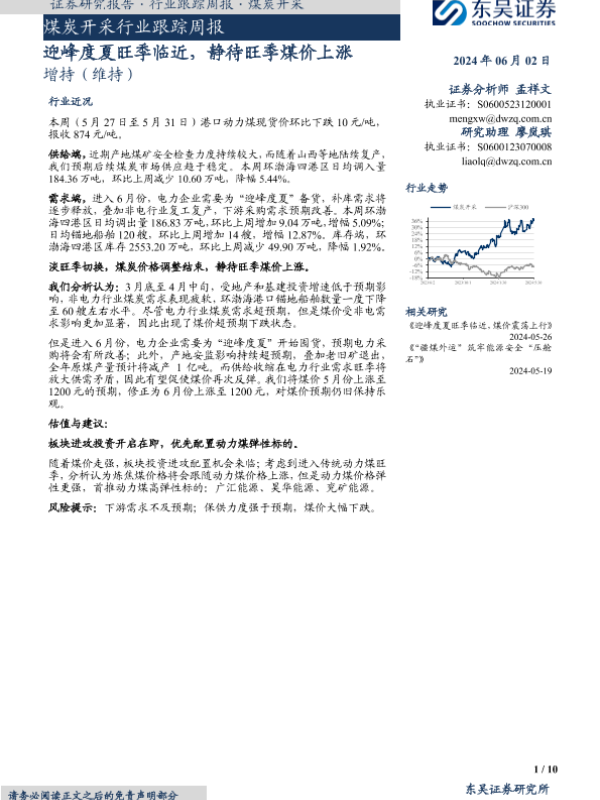 【东吴证券】【20240602】20240602-东吴证券-煤炭开采行业跟踪周报:迎峰度夏旺季临近,静待旺季煤价上涨-10页