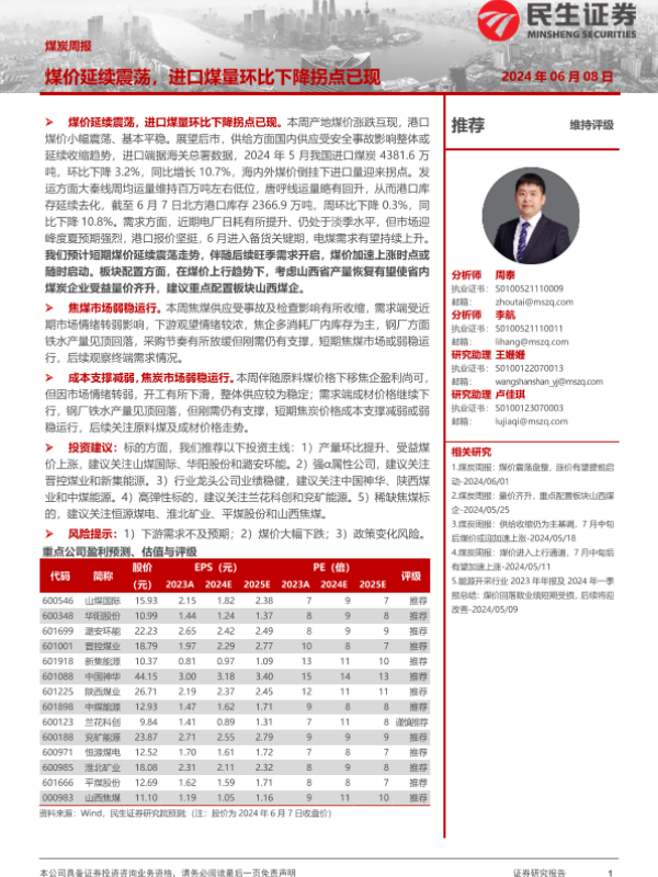 【民生证券】【20240608】20240608-民生证券-煤炭周报:煤价延续震荡,进口煤量环比下降拐点已现-24页