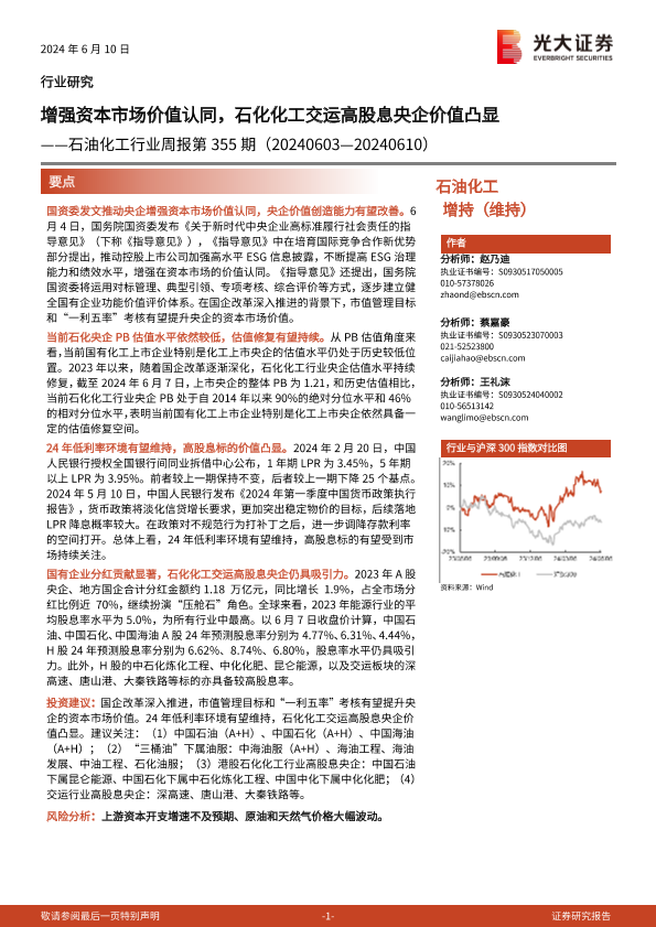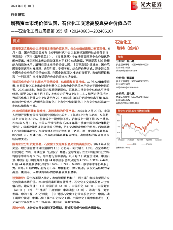 【光大证券】【20240610】20240610-光大证券-石油化工行业周报第355期:增强资本市场价值认同,石化化工交运高股息央企价值凸显-20页