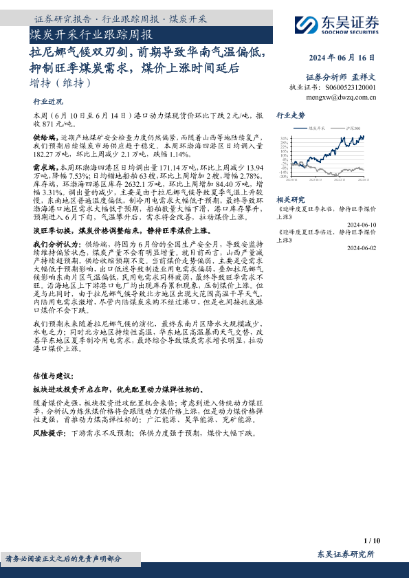 【东吴证券】【20240616】20240616-东吴证券-煤炭开采行业跟踪周报:拉尼娜气候双刃剑,前期导致华南气温偏低,抑制旺季煤炭需求,煤价上涨时间延后-10页
