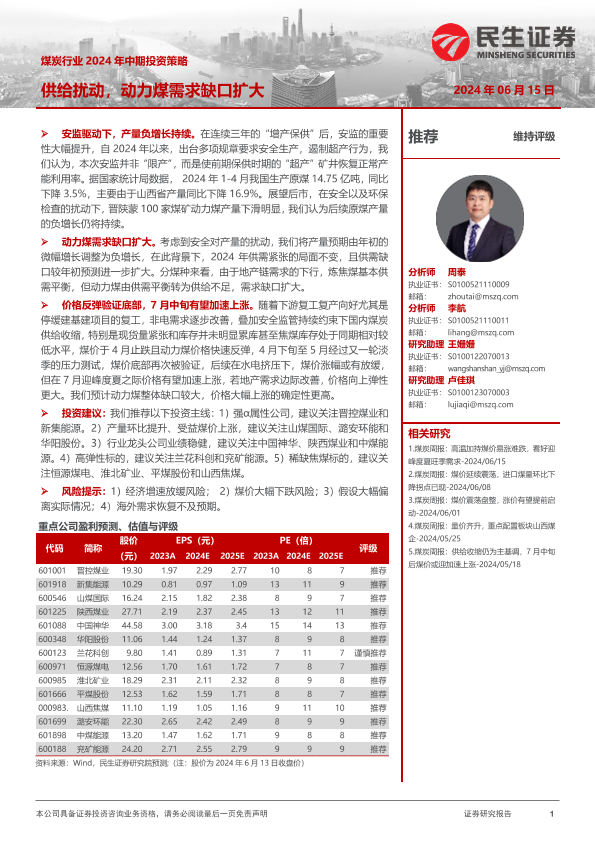 【民生证券】【20240615】煤炭行业2024年中期投资策略:供给扰动,动力煤需求缺口扩大-20页
