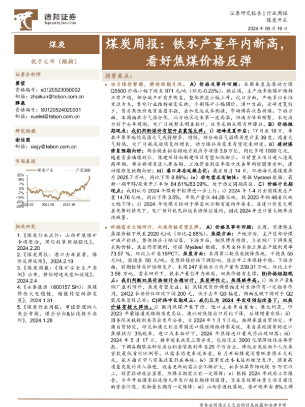 【德邦证券】【20240616】煤炭周报:铁水产量年内新高,看好焦煤价格反弹-17页