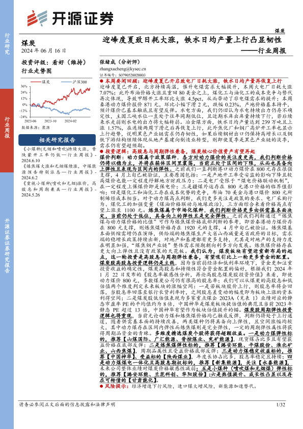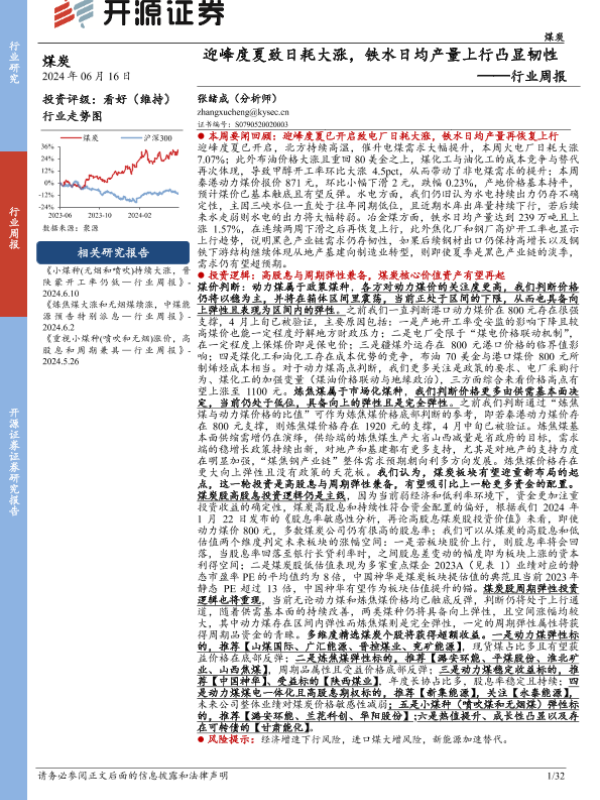 【开源证券】【20240616】煤炭行业周报:迎峰度夏致日耗大涨,铁水日均产量上行凸显韧性-32页