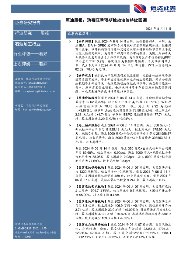 【信达证券】【20240616】原油周报:消费旺季预期推动油价持续回调-28页