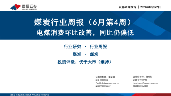 【国信证券】【20240622】20240622-国信证券-煤炭行业周报(6月第4周):电煤消费环比改善,同比仍偏低-30页