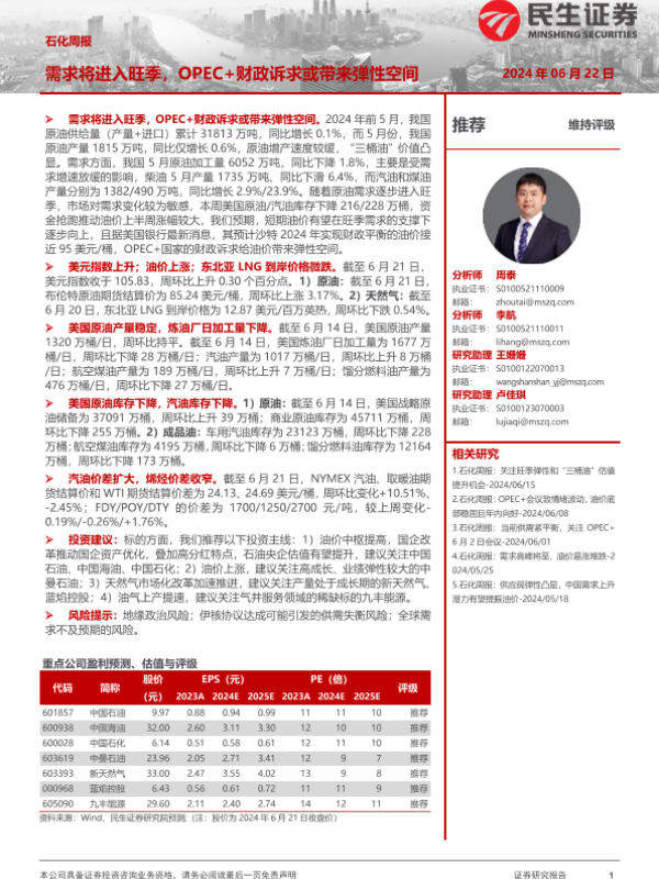 【民生证券】【20240622】20240622-民生证券-石化周报:需求将进入旺季,OPEC+财政诉求或带来弹性空间-29页