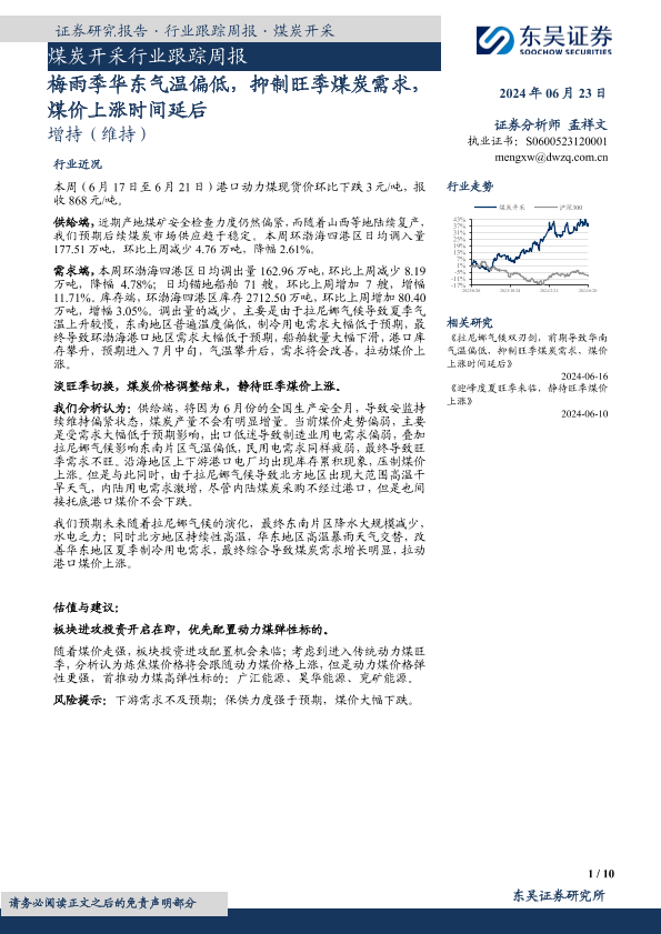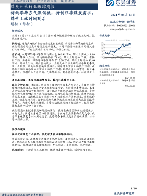 【东吴证券】【20240623】20240623-东吴证券-煤炭开采行业跟踪周报:梅雨季华东气温偏低,抑制旺季煤炭需求,煤价上涨时间延后-10页
