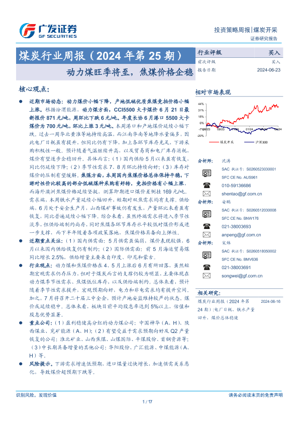 【广发证券】【20240623】20240623-广发证券-煤炭行业周报(2024年第25期):动力煤旺季将至,焦煤价格企稳-17页