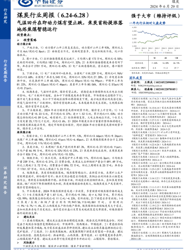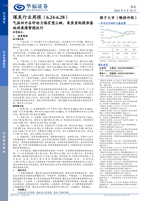 【华福证券】【20240629】20240629-华福证券-煤炭行业周报:气温回升在即动力煤有望止跌,焦炭首轮提涨落地炼焦煤暂稳运行-15页