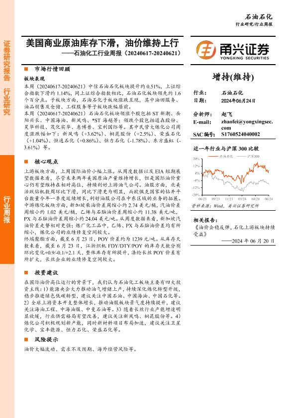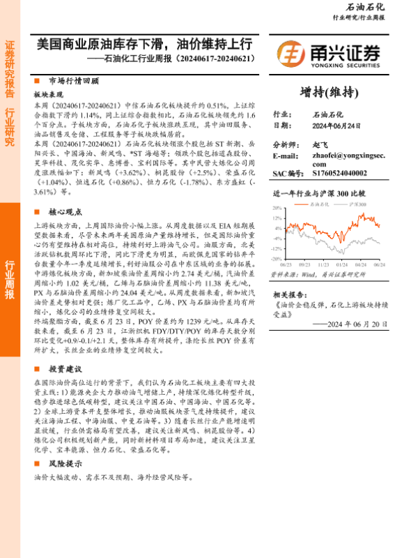 【甬兴证券】【20240624】20240624-甬兴证券-石油化工行业周报:美国商业原油库存下滑,油价维持上行-12页
