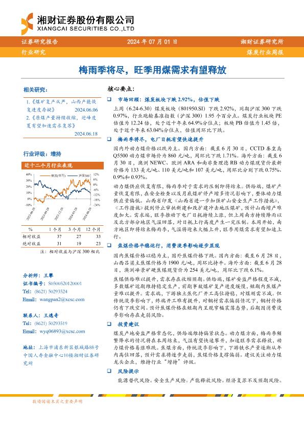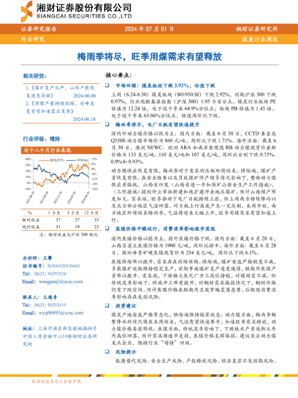 【湘财证券】【20240701】20240701-湘财证券-煤炭行业周报:梅雨季将尽,旺季用煤需求有望释放-14页