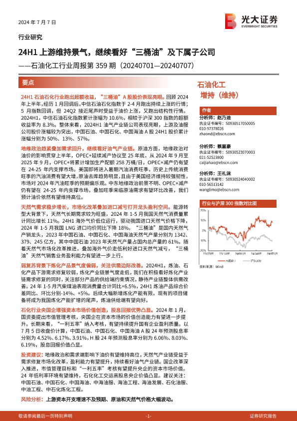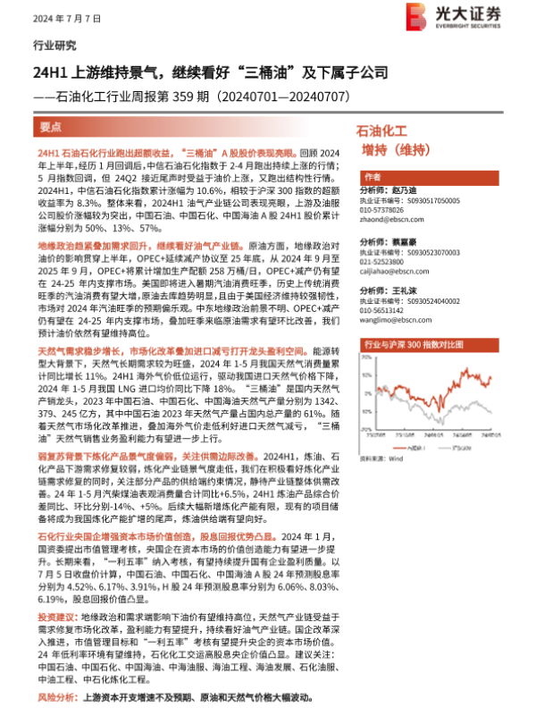 【光大证券】【20240707】20240707-光大证券-石油化工行业周报第359期:24H1上游维持景气,继续看好“三桶油”及下属子公司-23页