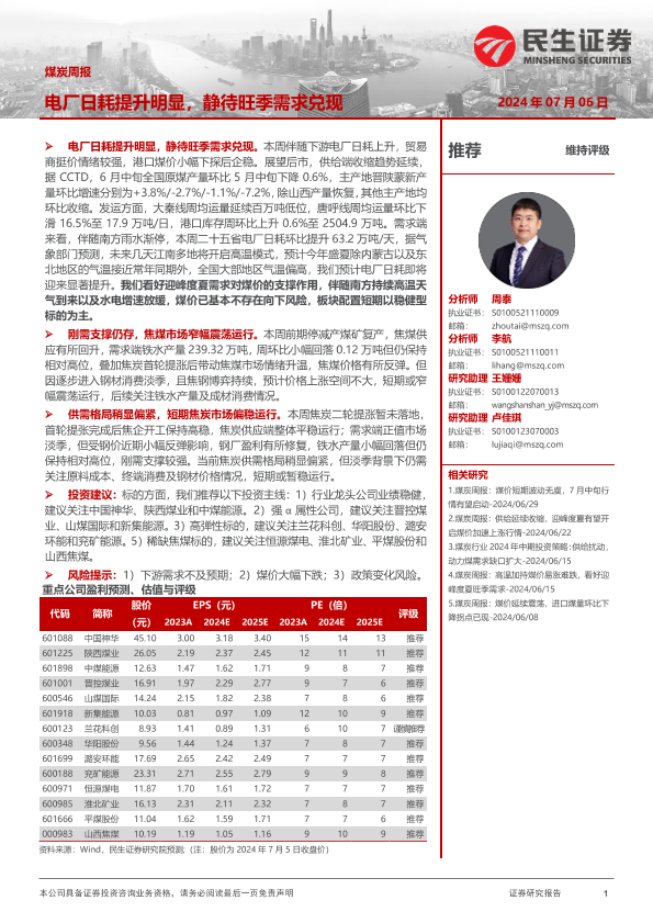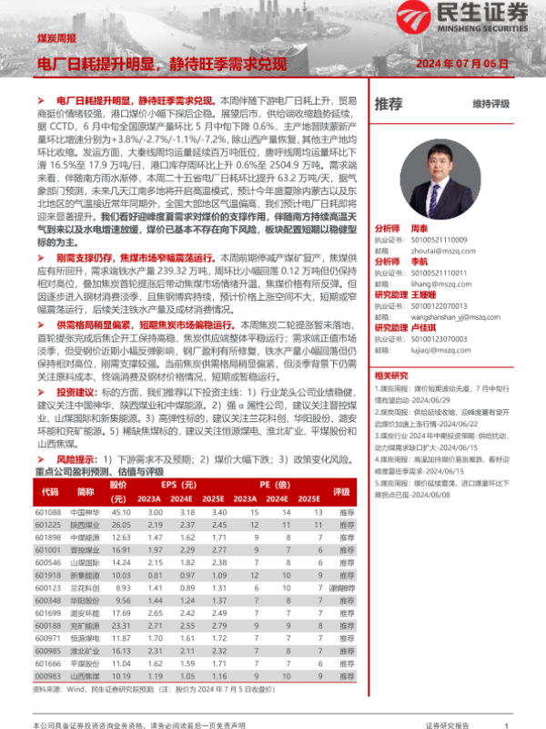 【民生证券】【20240706】20240706-民生证券-煤炭周报:电厂日耗提升明显,静待旺季需求兑现-24页