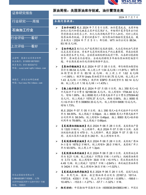 【信达证券】【20240707】原油周报:美国原油库存锐减,油价震荡走高-28页
