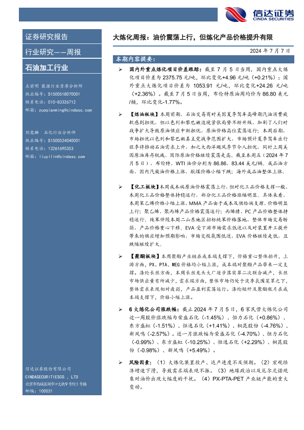 【信达证券】【20240707】大炼化周报:油价震荡上行,但炼化产品价格提升有限-20页